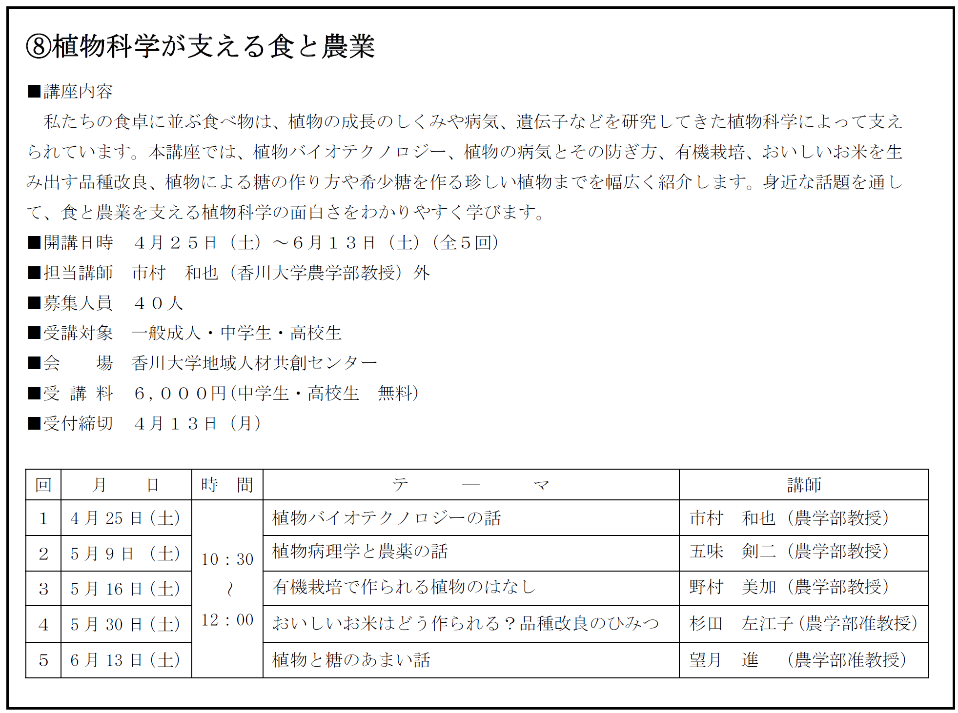 ※「⑧植物科学が支える食と農業」につきましては、各回担当される講師が異なります。